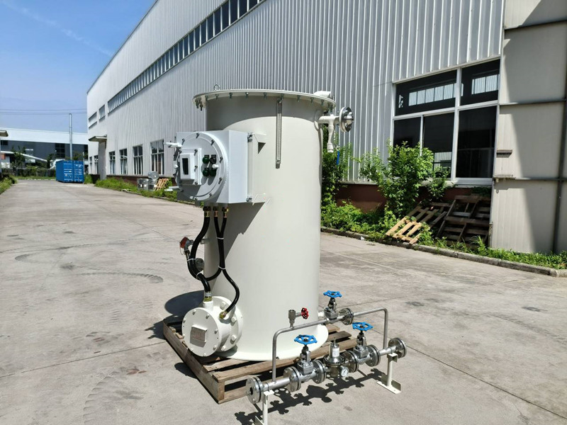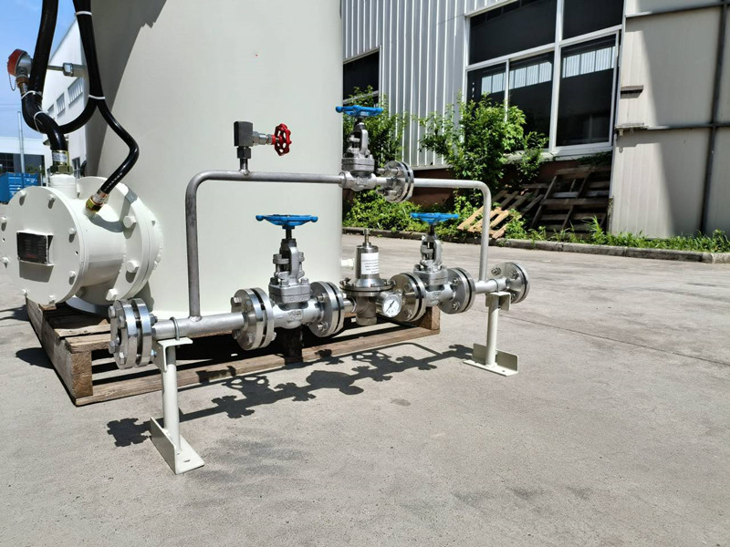 液氨瓶送來的氨經(jīng)過進氨閥進入汽化器。汽化成氣態(tài)氨,一般汽化后的氨壓力控制在0.4-0.5MPa,氨氣經(jīng)減壓閥減壓后,壓力調(diào)到0.05 MPa左右。經(jīng)過降壓后的氨氣由耐腐流量計量,從流量計流出的氨氣在熱交換器中進行熱量交換,使氨氣溫度升高,由分解爐出來的高溫混合氣被降溫,經(jīng)升溫后的氨氣進入分解爐進行分解成氫氮混合氣,